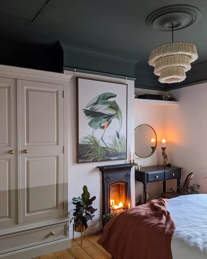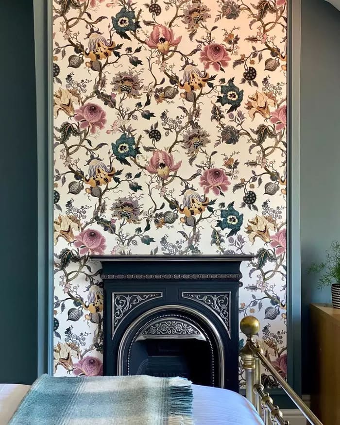 This one is pure poetry. A bold botanical wallpaper frames a black cast-iron insert, and the contrast is delicious. If your house has a blocked fireplace, copy the look anyway. Wrap the chimney breast in floral paper, paint the surround a deep inky blue or green, and keep bedding simple so the pattern sings.