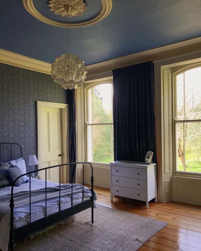 Ceiling painted deep blue, ornate medallion, white moldings, and tall windows. The iron bed keeps it classic, not costume.