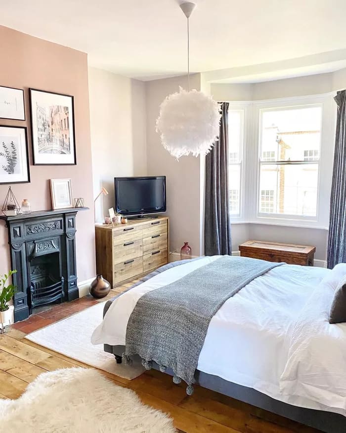 Soft pink can go cheesy fast. Not here. The black fireplace grounds it, white bedding calms it, and the fluffy pendant is just plain fun. If you’re tempted by pink, choose one with a brown or dusty base, not bubblegum. Then add gray throws and wood furniture so it reads grown up. I’d layer a shaggy sheepskin by the hearth for morning toes.