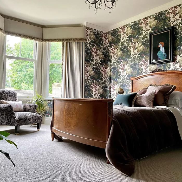 This room is drama in the best, Downton-after-dark way. Big blossoms on the walls, a warm wood sleigh bed, and a cheeky leopard chair. Key is restraint elsewhere. Keep the carpet and lamps quiet. Use velvet pillows in one or two colors so the wall is the star.