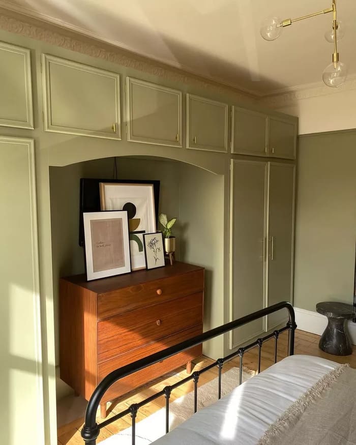 Function wearing a pretty dress. Floor-to-ceiling cabinetry wraps the room and tucks a mid-century dresser into a niche. The soft green paint and little brass knobs feel period without being fusty. Color-drench the trim and doors in the same shade for the custom vibe.