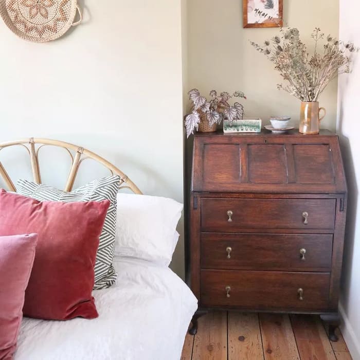 Victorian rooms don’t have to be heavy. Here, a curved rattan headboard brings airiness next to a moody old drop-front desk. Dried stems in a little jug, terracotta tones, and rumpled linen do the rest.