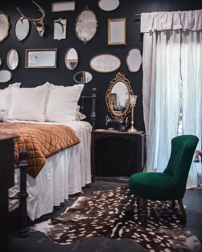 Goth romance, but cozy. Dozens of vintage mirrors hung salon-style over black paint, white bedding, and a green velvet slipper chair. If you try this, unify the frames by sticking to gold and black. Hang mirrors low and high so the wall looks intentional, not random.
