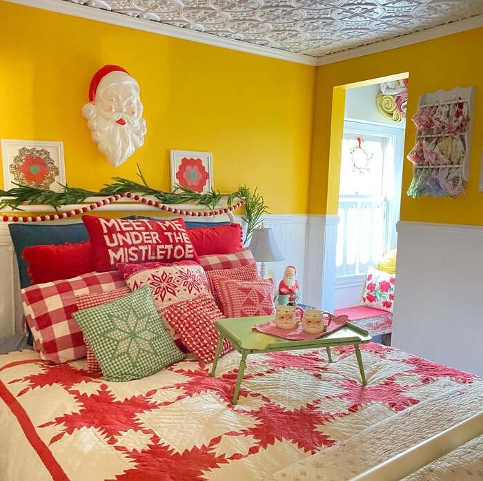 Sunny yellow walls, candy red quilts, and kitsch Santa