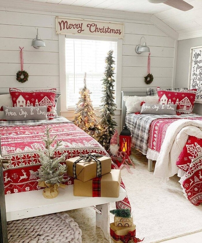 If you’re styling a kids’ nostalgic Christmas bedroom, repeat shapes. Stars, houses, trees. Choose two for each bed so the sets relate. Add soft white rugs for morning toes. Hang tiny wreaths with red ribbon on the wall lamps for a sweet touch that costs a few dollars. Pull a bench between the beds to hold books and night cocoa trays. This is how to make a retro Christmas bedroom that’s playful and still tidy enough for grandparents to love.