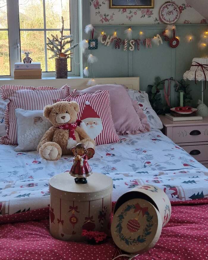 To try a vintage-inspired holiday bedroom like this, limit the palette to three shades. Rose, cherry, and creamy white worked for me. Use round boxes on the bench for storage that also looks decorative. Add a small tabletop tree with feathery ornaments. If your room tilts cute, balance with greenery in an aged pitcher and some worn wood pieces. The mix of sweet and rustic keeps it from feeling like a toy store and more like a true vintage christmas bedroom heirloom.