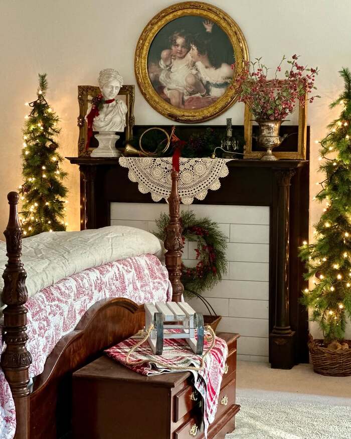 This one made me gasp a little. Dark wood, a portrait with a gold frame, lace runner, and two slim glow trees flanking the mantle. The four-poster bed wears a red toile quilt that whispers story tales. A wreath leans casually on the hearth, and a marble bust wears ribbon like a scarf. It’s drama, but it’s kind drama, the kind that invites tea and shortbread.