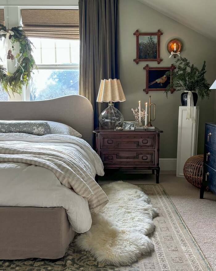 This final room is my winter exhale. Muted green walls, linen bedding, and a plush sheepskin runner that makes bare feet happy. The nightstand is a carved beauty, and the art feels museum calm. A small evergreen sits in a black vase. The candles are slim and modern, which balances the older furniture. Roman shades bring in texture, and the heavy drapes keep everything cozy when wind knocks the windows.