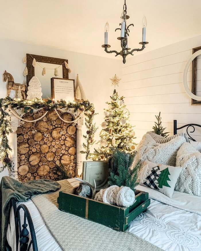 Nothing says old-time holiday like a fireplace, and this clever faux mantel is packed with cut log rounds for texture. Garlands swagged with wool pom trim pull the eye across the wall, while a slim tree sparkles beside layers of creamy cable-knit pillows. A green wooden crate becomes a tray for twine balls, antlers, and storybook vibes. The shiplap backdrop keeps everything farmhouse tidy.