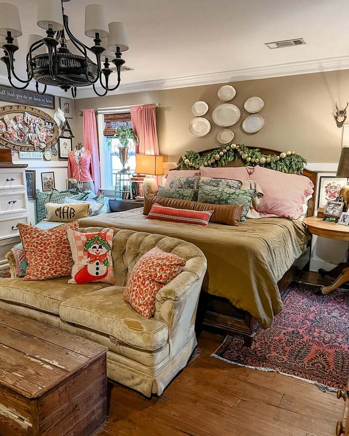 This is the grandma-in-the-best-way room. There’s a plate wall over the bed, a tufted loveseat at the foot, chintz and checks living together, and a big droopy wreath wrapped across the headboard. It’s loud but warm. The magic is how the palette repeats. Olive, rose, and creamy white show up over and over, so your brain says yes even with all the layers. I’d call this a joyful retro Christmas bedroom that proudly collects memories.