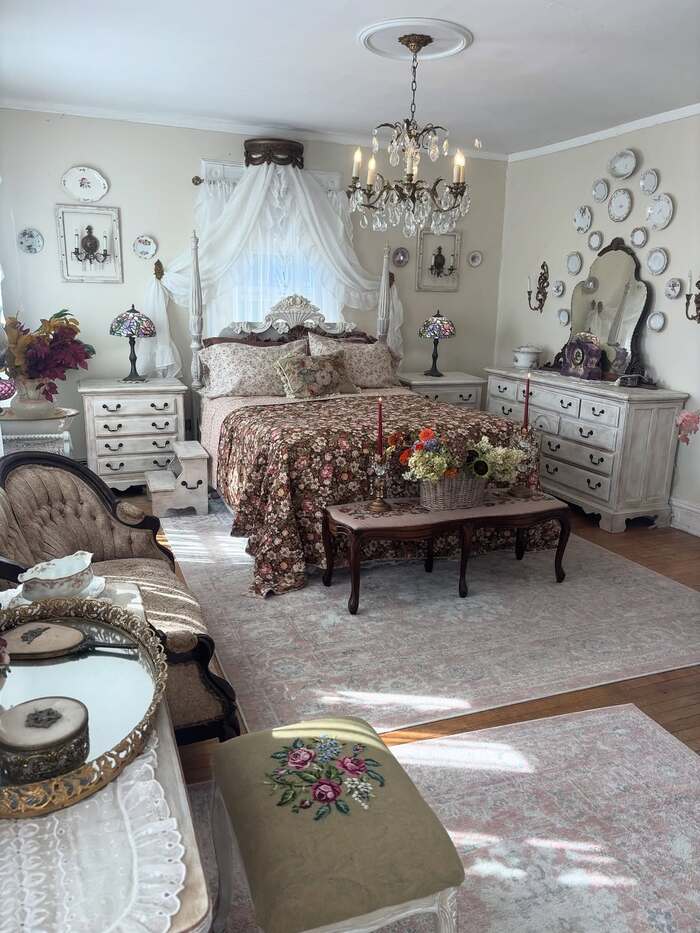 This one is pure storybook. A lace canopy hugs the headboard, crystal chandeliers glitter, and the bedding is floral but grounded with a dark wood bed. Painted dressers bring in that worn, creamy patina you can’t fake easily. Small plates on the walls add rhythm. It’s very Victorian Christmas bedroom, yet it doesn’t feel stiff because the linens are soft and the light is buttery.