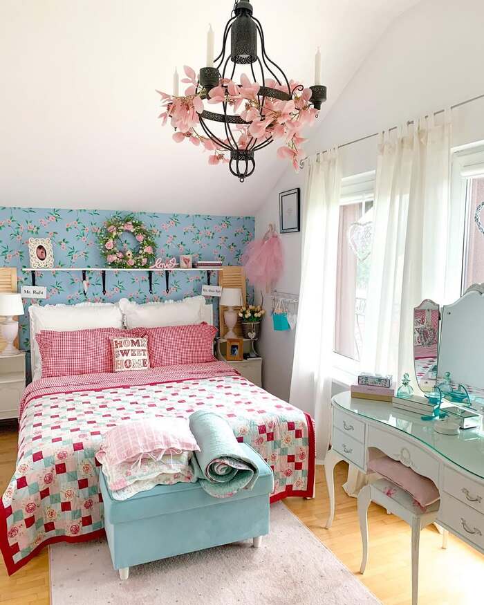 Aqua wallpaper, pink chandelier, and cherry quilts