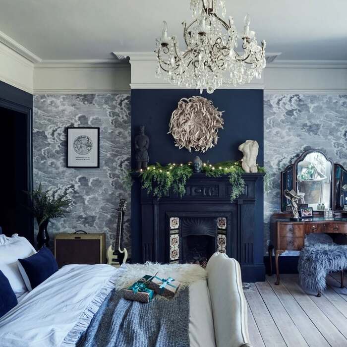 Moody lovers, hi. This room is artful. Marbled gray wallpaper swirls like winter sky around a matte navy fireplace. A lush garland sits across the mantel, and a crystal chandelier twinkles like ice. Deep blue pillows and gray throws keep the bed tailored. It’s a vintage holiday bedroom that feels like a city townhouse, not a cabin.