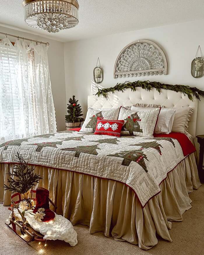 This bed wears a story. The quilt has patchwork trees with cranberry borders, and the gathered skirt pools to the floor like a holiday gown. A carved half-round over the bed acts like quiet art. Wreaths and tiny trees keep the theme consistent without cluttering the room. It’s a classic Christmas bedroom with a handmade heart.