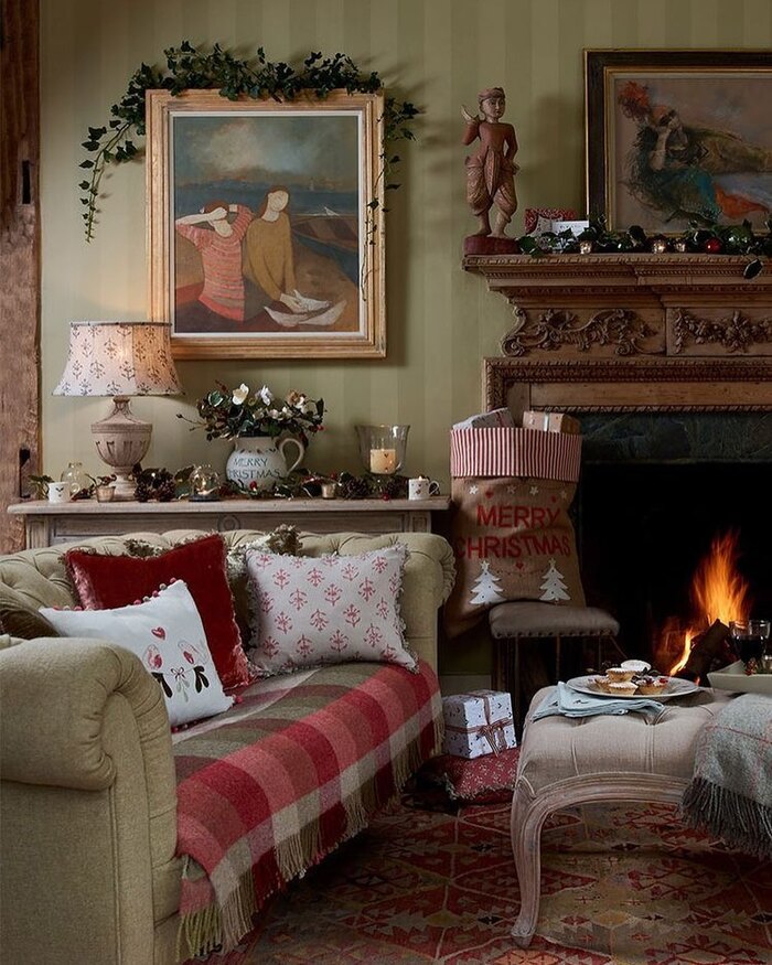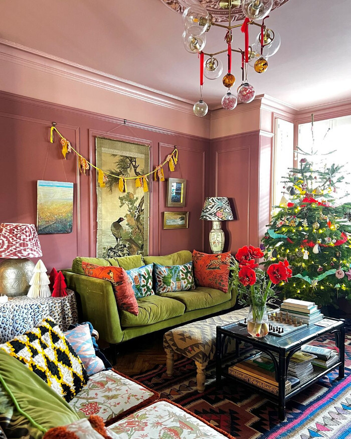 This one had me grinning like a kid. Mauve-pink walls with a moss-green sofa and patterned pillows everywhere. There’s a banner, a chessboard on the coffee table, and a Christmas tree sprinkled with handmade ornaments. It’s joyful chaos, but smart chaos. The lesson for a 18+ vintage christmas living room is to pick two big colors and then let patterns from different decades be friends. I count ikat, floral, and geometric. Somehow it works because the tones relate.