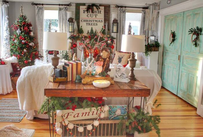 The last room is bright and homey. Turquoise sliding doors, a console table with lamps, and signs about fresh cut Christmas trees. There are little wreaths everywhere and a mix of white throws and red accents. It’s the down-to-earth side of a vintage Christmas living room, and it made me think of hot cocoa after sledding. The floors glow honey-gold and bounce light around.