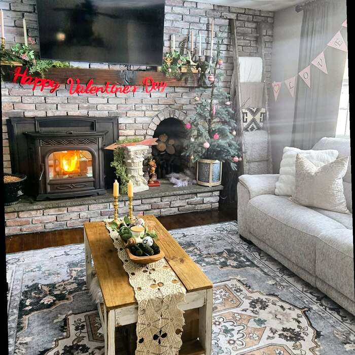 This room hits me right in the cozy. A gray brick fireplace wall holds a black iron stove, so the flame glows like honey. On the coffee table there’s a lace runner that probably came from someone’s aunt, and I’m jealous because I want one too. A petite tree stands on a pedestal by stacked firewood, with blush ornaments and a ribbon that softens the masonry. It’s a retro Christmas living room that feels like warm toast.