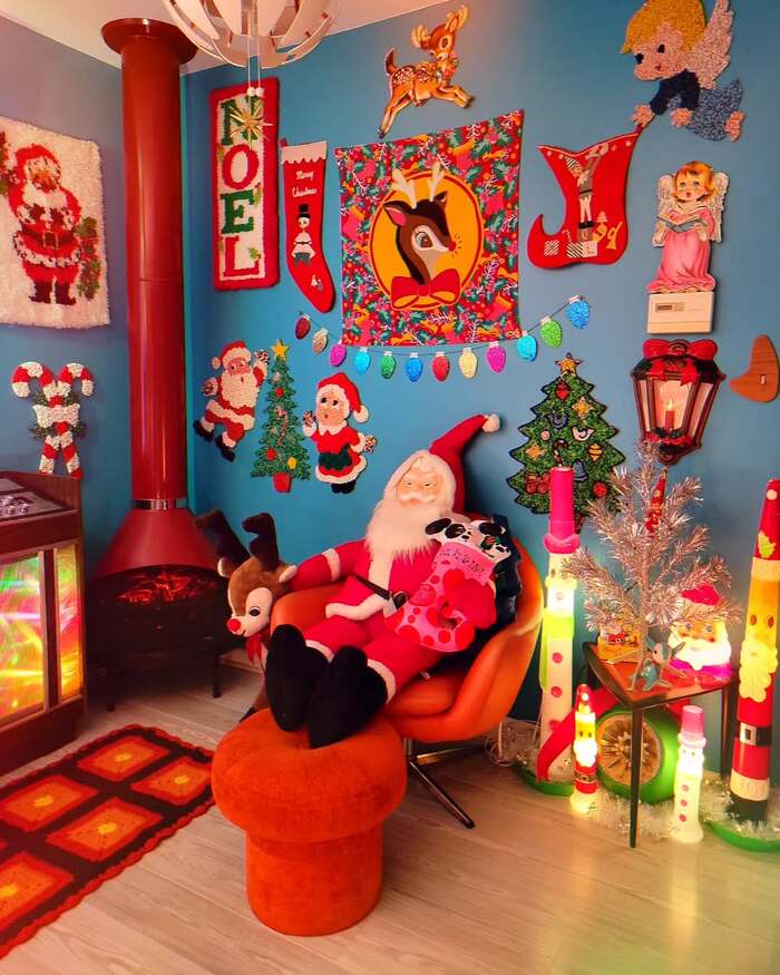 This one is pure fun. Teal walls. An orange chair that looks like a gumdrop. A blow-mold Rudolph smiling like he knows the punchline. There’s even a shiny aluminum tree and a parade of plastic candles. It leans hard into midcentury holiday style, the kind of nostalgic Christmas living room that makes every kid feel seen, including the grown up ones. My confession. I used to think kitsch was tacky. Now I think it’s joy.