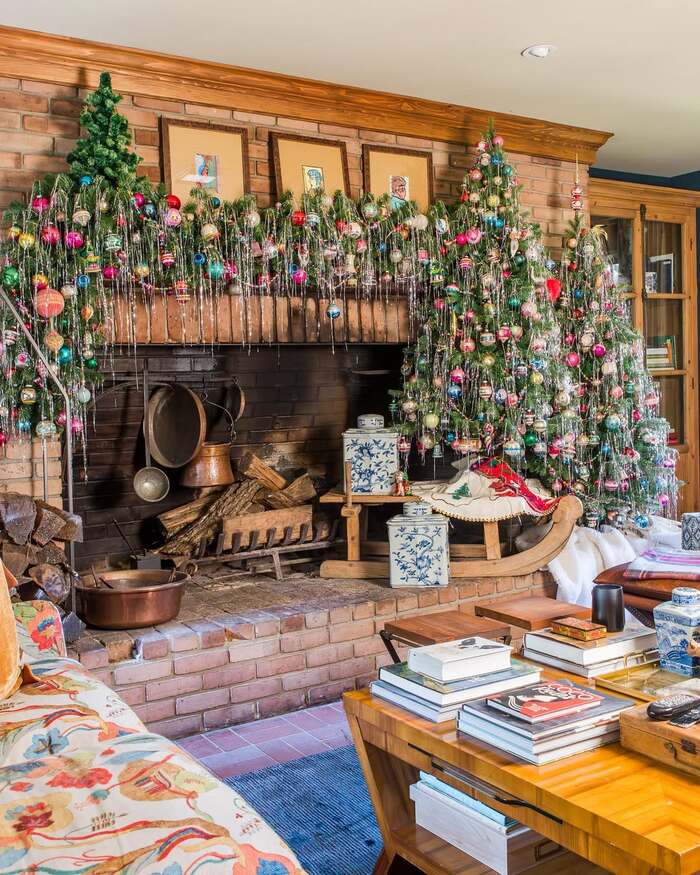 Here the fireplace is built with brick and pure memory. Two skinny trees, dripping with tinsel and Shiny Brite style ornaments, stand guard. Garlands spill across the mantel like sparkly waterfalls. It’s a classic Christmas living room decor move, but piled high so it reads festive from the street. The copper pots and blue-and-white jars on the hearth balance the cool shimmer with warmth. This is a 18+ vintage christmas living room that leans into midcentury holiday magic.