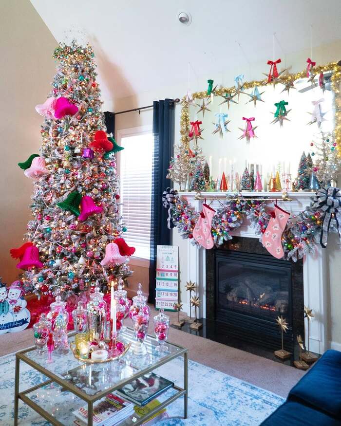 This room is peppermint-sweet. A tall glittering tree, pink felt bells, and a glass coffee table filled with jars of candy-colored ornaments. The mantel has sparkle garlands and stockings with embroidered flowers. It feels like a retro Christmas living room straight out of a 1962 magazine in the happiest way. My opinion. Pastels are not just for spring. They lighten winter and make the twinkle lights brighter.