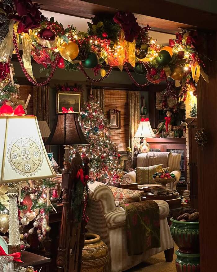 We switch to maximalist magic. The walls are wrapped with framed prints in a repeating pattern, like a vintage storybook border. Overhead, garland slides around the room with big red bows, and the sofa is mountain-high with pillows. There’s lace on the ottoman and a tray with cocoa fixings. It’s a retro holiday living room that says stay a while, we got treats. My honest take. It looks busy in photos but in person it probably feels like a hug.