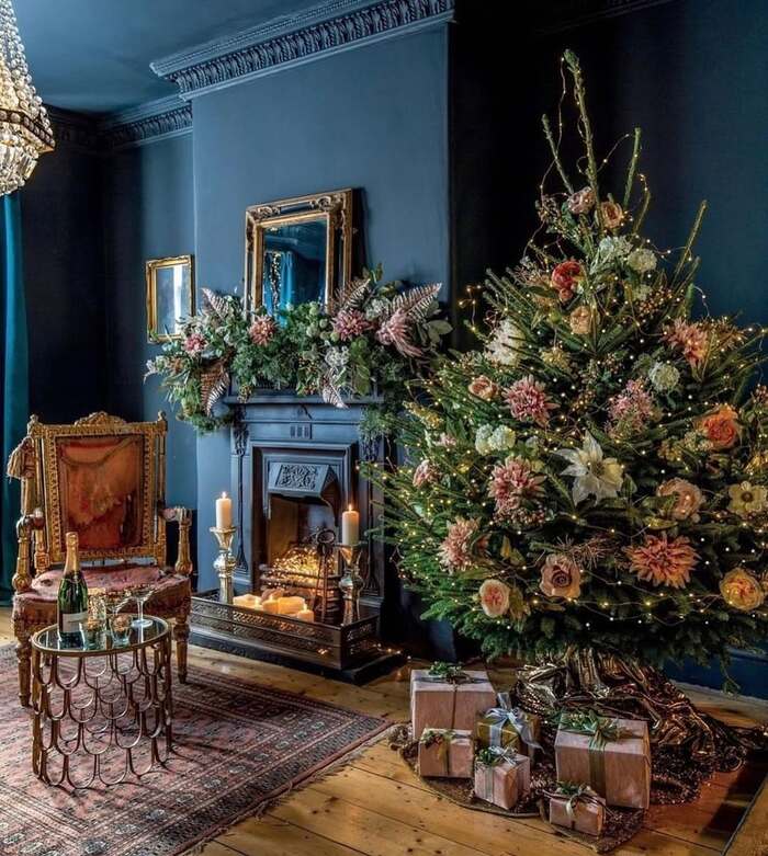 Here, the walls are moody gray, the tree is natural and tall, and the fireplace is black and stately. A leather wing chair sits ready for cocoa. Gold ornaments and warm fairy lights bring the glow. It’s elegant without being stiff. If you want an antique Christmas living room that feels collected by a book lover, this is it. I personally crave this look on cold nights when I want quiet.
