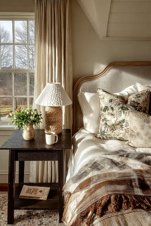 Here’s what I keep seeing in these rooms. Warm natural light, in big windows or little ones, but always softened by creamy curtains. Neutral walls that lean warm. Then texture stacked on texture. Linen, nubby cotton, washed wood, rough metal. It looks collected, not perfect. It works because our brains love calm rhythm. Repeated tones and shapes. Then one or two surprises, like a mint nightstand or a bold orange pillow, wake the space up without yelling.