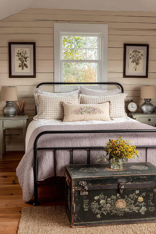 Last scene, a soft lilac quilt with tiny texture and a long embroidered pillow. The black iron bed draws a neat line in front of cream shiplap walls. Two green nightstands echo the garden outside the window. On the jute rug sits a painted black trunk with hand drawn flowers. A little jar of yellow blooms says fresh, even in winter. An old school alarm clock feels honest. Nothing plastic screaming at you.
