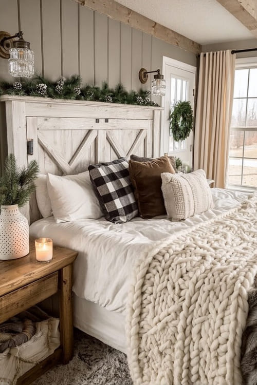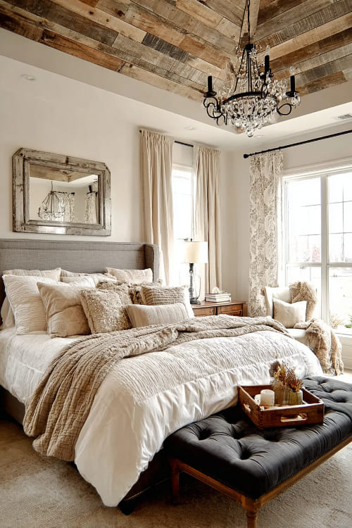 Ceiling trick: if your ceiling is plain, add simple 1x4 beams and stain them. You get the feeling of wood without covering the whole thing. Hang a dimmable chandelier on a canopy mount so wiring stays neat. Use a mirror with chipped paint to bounce light back on the bed.