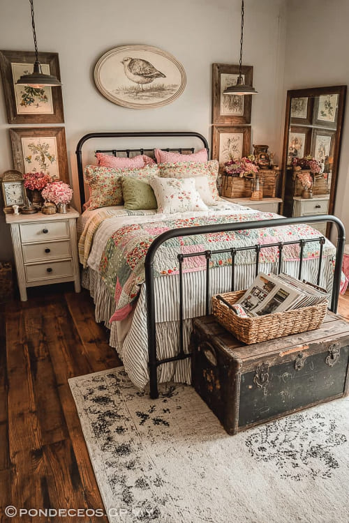 The black iron bed gives structure while the floral quilt and stripe skirt keep it sweet. Hanging metal pendants add farmhouse grit. Above the bed, a sketch of a little bird. On both sides, framed botanicals with rough wood frames. At the foot sits a weathered trunk with a wicker basket of magazines. The rug is light but a little speckled, so dirt hides a bit. The wood floor looks hand rubbed and shiny in spots.