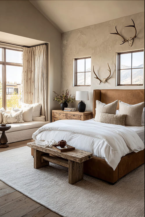 That caramel bed wrapped in leather is so soft on the eyes. White bedding piled high, pillows in oatmeal and wheat colors, a simple bench made from chunky reclaimed wood, and two small windows that frame the mountain view. The plaster wall is imperfect in a good way. Antlers bring shape and height. A black ceramic lamp and vase are the only deep tones so your eyes rest.