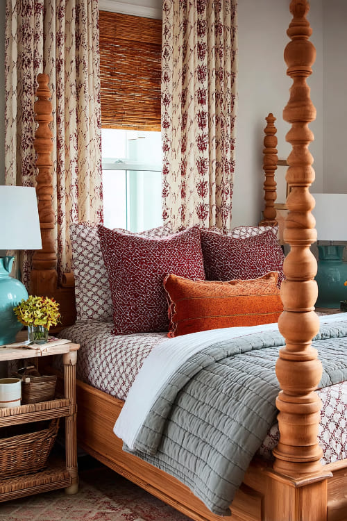 See those thick turned wood posts. They feel like a piece of sculpture. The bedding mixes tiny red pattern with a rust lumbar pillow and a soft gray quilt, while blue green lamps sit on open rattan shelves. Curtains and bamboo shade layer texture over texture. It is busy but not noisy because colors stay in the same family.