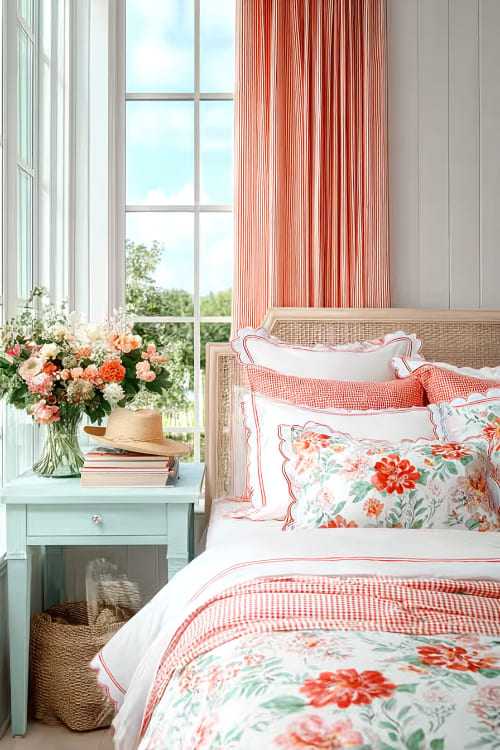 This bright setup makes me want orange juice at the window. Coral striped curtains meet floral scalloped pillows with gingham edges. The nightstand is a happy mint, topped with books, a straw hat, and a giant glass vase of garden flowers. White shiplap walls push the light around like a mirror but softer.