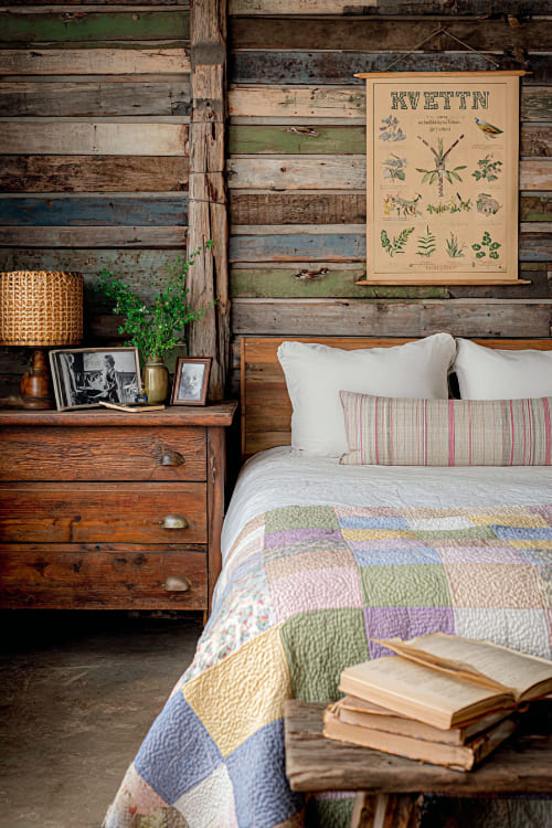 That plank wall is a whole story. Scratched layers of green and blue and bare wood. An antique dresser with cup pulls. A wicker lamp, black and white family photos, and a botanical school chart with charming letters. The bed carries a soft patched quilt and a long striped bolster. Books sit on a little bench that’s uneven but in a cute way.