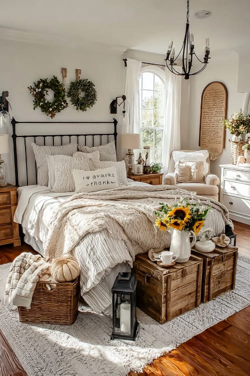 Here the bed wears stripes and chunky knits. Two green wreaths hang over a black metal headboard, while white curtains glow around an arched window. At the foot, two wooden crates act like a bench and coffee table. There’s a lantern on the rug, a little pumpkin tucked in a basket, and a white pitcher spilling sunflowers. Everything whispers autumn without shouting pumpkins everywhere.