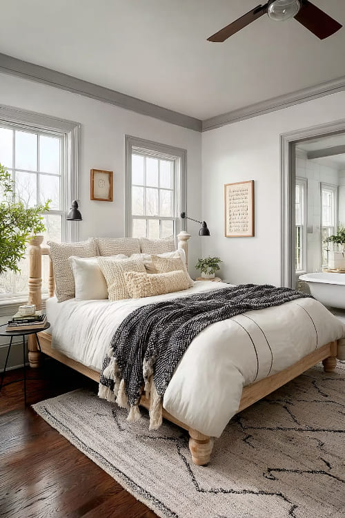 This one is modern farmhouse done right. Pale gray trim frames tall windows. A light wood bed with round turned legs sits on layered rugs, and a chunky black throw drops across white duvet. Little black sconces clip the art and also act like reading lights. A doorless opening shows a clawfoot tub and pretty plants.