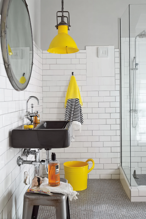 The first room is crisp and punchy. White subway tile climbs the walls with tidy grout lines. A shiny glass shower sits at the right, very clean and simple. The star is a small charcoal wall sink with a chrome faucet, and everything wakes up under a bold yellow pendant. There’s a matching yellow bucket and a striped towel with a lemon edge. Penny tile on the floor adds texture without shouting.