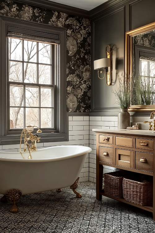 Dark floral wallpaper on the top half of the wall, subway tile on the bottom, deep gray trim, and a freestanding clawfoot tub with gold feet. The vanity is wood with brass pulls and baskets below. A big gold mirror ties the metals together.