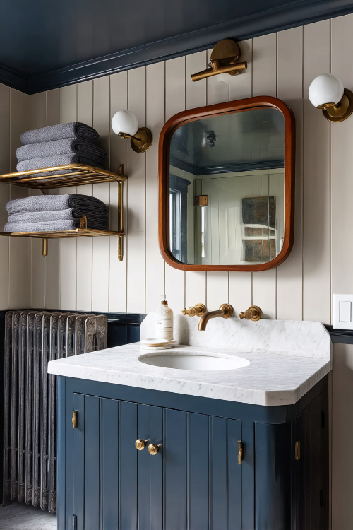 That first bath nails the mood. Beadboard walls in warm cream meet a deep navy vanity with a chunky marble top. Brass wall taps float over the backsplash. A wood framed mirror softens all the metal, and round globe sconces throw calm, even light across the sink. The old radiator and brass towel shelves add story without clutter.