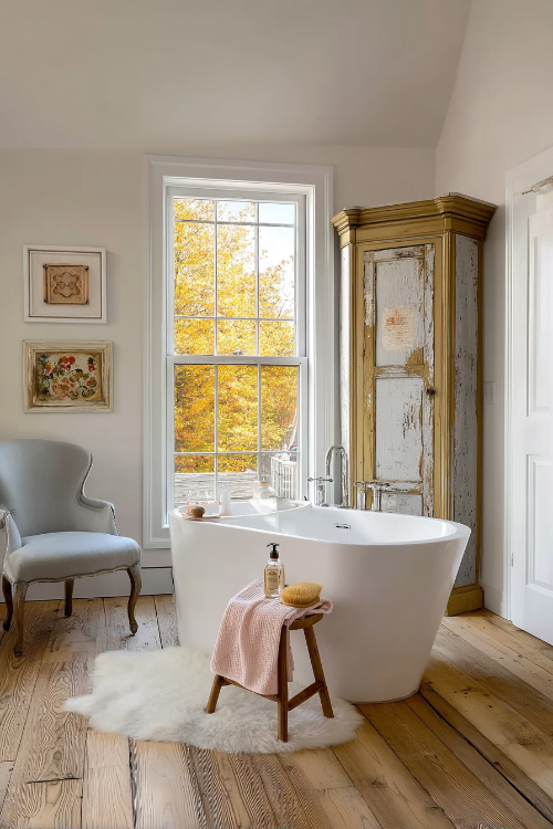 This room is sunshine and quiet. A sleek white soaking tub sits on warm planked floors. Beside it stands a tall chipped armoire in honey gold, the kind you want to touch. A pale blue chair and a tiny wood stool sit on a fluffy sheepskin rug. The big window frames autumn leaves and spreads natural light like butter.