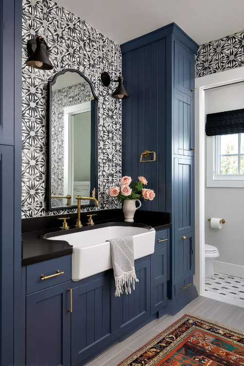 Next comes the bold one. Floor to ceiling shaker cabinets in inky blue surround a white apron sink. The faucet is brass with old school handles. Behind the mirror, black and white patterned tile brings movement, but the counters stay clean and black. A vintage style runner on the floor ties all the shades together.