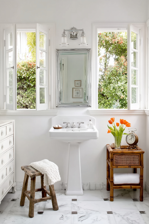 Now for the clean, quiet bath. White walls, white pedestal sink, white marble floor with tiny dark dots. Three casement windows swing open and flood the room with fresh air. A bamboo side table and a little worn wood stool keep it from feeling sterile. Chrome lighting and mirror reflect all that green from outside.
