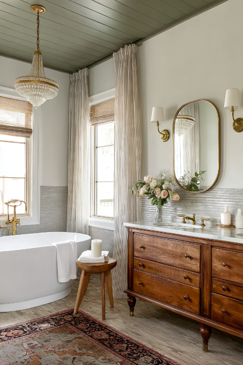 Last image, my favorite mix. A crystal chandelier drops from a sage ceiling. Long drapery filters the sun. Slim ripple tile wraps the walls halfway, then a vintage dresser vanity in rich walnut carries a marble top and brass hardware. An oval brass mirror and neat sconces give a gentle glow. A curved soaking tub and small wood stool finish the scene.