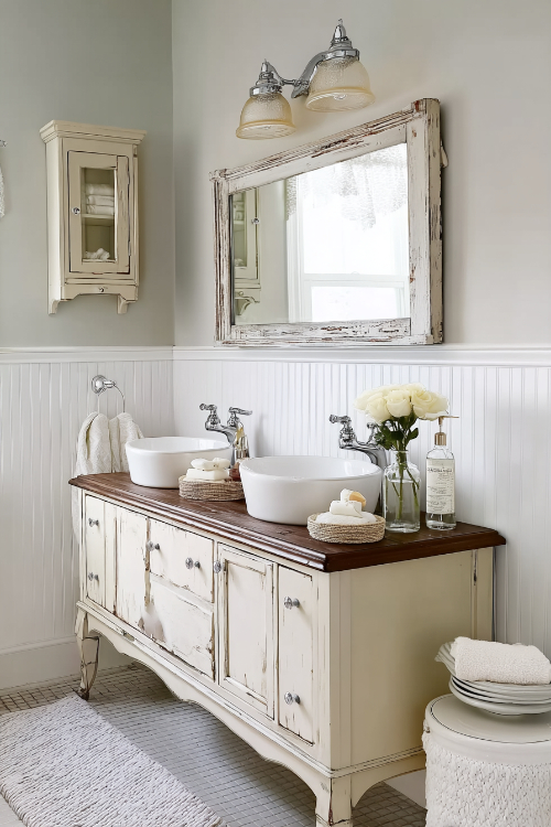 This second space is soft and pretty. A creamy, timeworn vanity with curved legs holds two white vessel sinks. The mirror frame is weathered and chunky, and the wall has beadboard that makes everything feel cottage sweet. The palette is oatmeal, cream, and warm wood with chrome taps that sparkle.