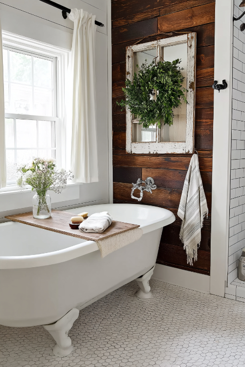 Picture number three brings in warmth. A white clawfoot tub sits on tiny hex floors. Next to it, a wall of rich stained boards adds cozy cabin mood. There’s a vintage window frame hung as decor with a green wreath, plus a jar of fresh cut stems on a narrow tub board.