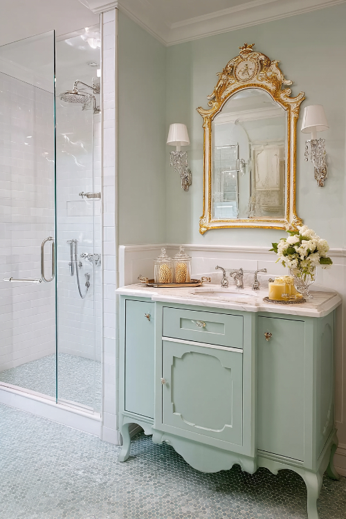 Here we get fresh color. The vanity is soft mint with curvy feet and crystal knobs. Above it hangs an ornate gold mirror with little crest details. Sconces sparkle with crystal drops. The shower is all glass and the floor is tiny aqua penny tile that glints like sea foam.