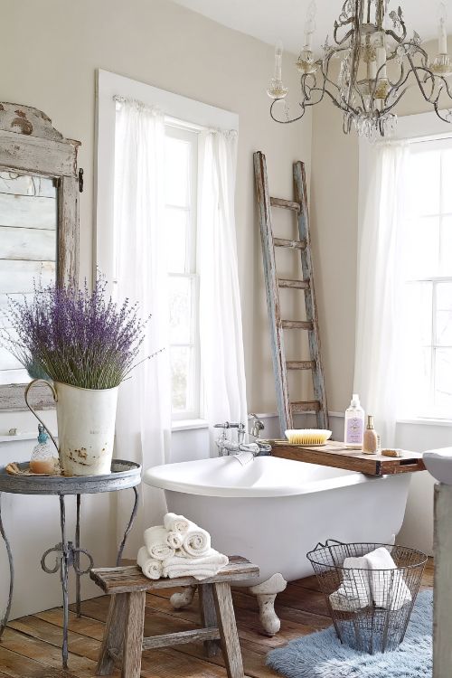 This image is farmhouse charm. Sunlight pours through white curtains. A clawfoot tub sits on warm wood floors. There’s a weathered ladder, a wiry basket of towels, a tiny side table, and a pitcher stuffed with lavender. The colors are gentle: cream, dusty blue, and the purple herbs.