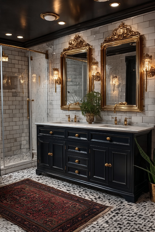 The sixth room is dramatic. Deep black vanity with brass knobs, white marble top, and two ornate gold mirrors. The walls shine with subway tile and the shower is framed in glass and brass. A patterned rug on the marble mosaic floor warms the space.