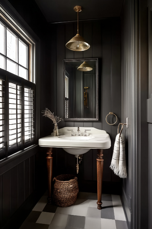 This small powder room proves dark walls can be calm. The paneled walls and ceiling are in deep charcoal. A pendant with a brass rim drops a cozy cone of light. The sink is a vintage console on turned wood legs, and a woven basket slides under for storage.
