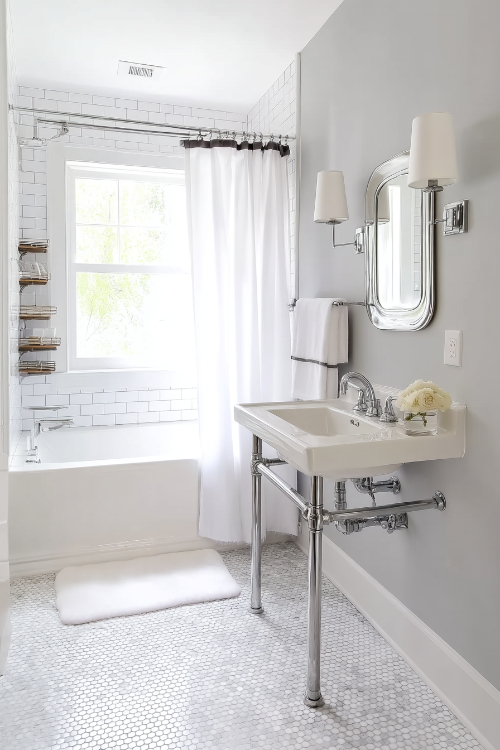 Here is the opposite mood. The walls are pale gray, the floors are tiny white marble hex, and the sink is a console style with chrome legs. A tall mirror with rounded corners bounces light. The tub and shower curtain glow near a big window.
